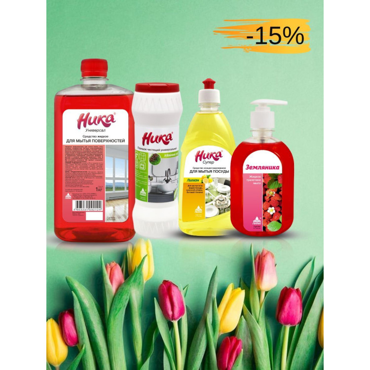 | Мыло жидкое туалетное «Земляника» - Состав: АПАВ, НПАВ. Средство для мытья посуды "Ника-Супер" - Состав: АПАВ >5%, НПАВ >5%, загуститель, комплексообразователь, ароматизирующая добавка, пищевой краситель. Чистящий порошок универсальный "Ника" - Состав: абразив более 50%, сода более 15%, кислородный отбеливатель, ПАВ, отдушка. Универсальное моющее средство "Ника-Универсал" - Состав: НПАВ менее 5%, АПАВ менее 5%, комплексообразователь, краситель, вода. | |
